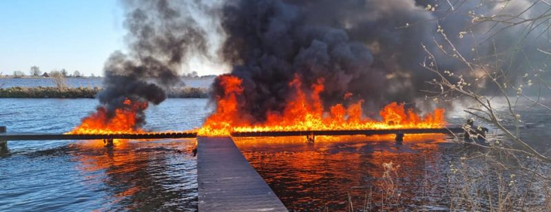 Afgelopen zaterdag 19 maart is er brand geweest aan de steiger TJ15G aan de Marchjepôlle in het Tsjûkemar. Een groot deel van de steiger is afgebrand. Erg zonde van deze populaire ligplaats. Om te voorkomen dat het kunststof zich verspreidt door het water, heeft de brandweer olieschermen aangebracht. Wij zijn de brandweer veel dank verschuldigd voor hun goede optreden. Omdat de brand mogelijk veroorzaakt is door brandstichting, doen wij aangifte bij de politie. Rond de tijd van de brand hebben getuigen gezien dat er een polyester kajuitjachtje van ca. 7 meter, met daarop een aantal jongeren, is weggevaren. Heeft u hier meer informatie over, dan vragen wij u om dit bij ons te melden (058-212 85 81 of info@marrekrite.bwhvue2.nl). Foto: Brandweer Echten