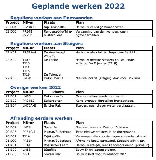 Het moment van uitvoering is afhankelijk van de planning van de aannemer, het weer en andere (onvoorziene) omstandigheden. Tijdens de werkzaamheden is het vaak niet mogelijk om van de betreffende ligplaats(en) gebruik te maken. Op dat moment staan ze als ‘gestremd’ op onze website kaart.